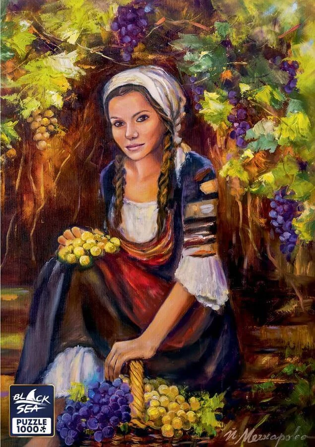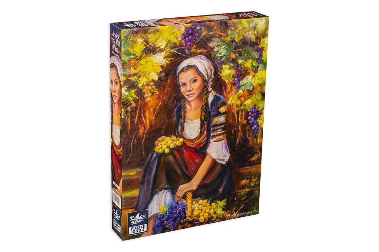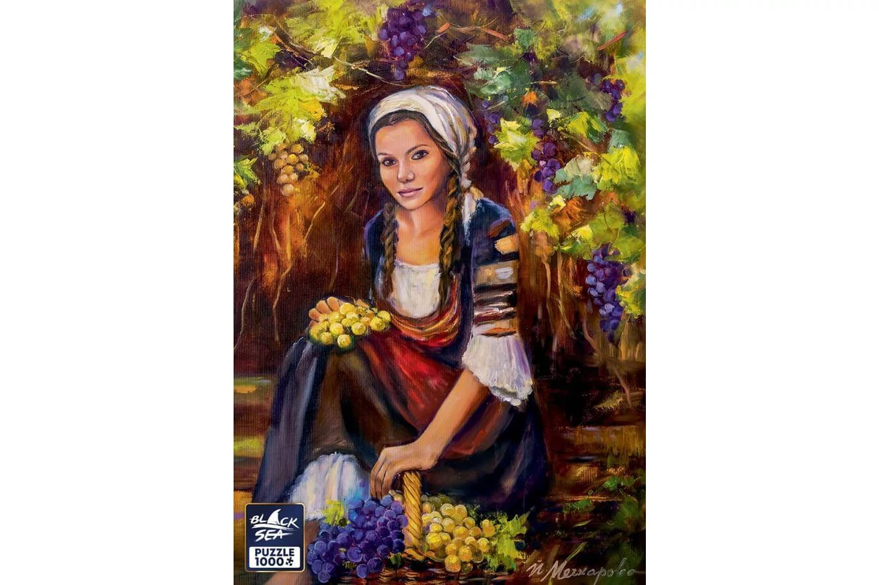 Egy fiatal női alakot látunk a szőlőtőkék árnyékában. A Black Sea BS42201 - Under the Old Vine - 1000 db-os Premium puzzle mediterrán hangulatát meleg fények és természetes részletek teszik teljessé.