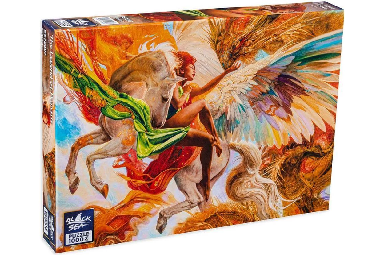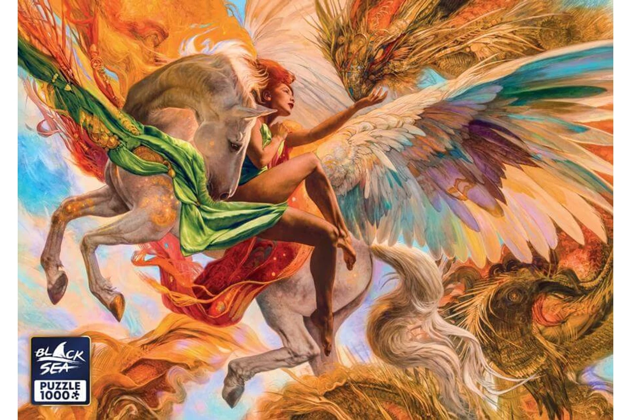 A mitikus szárnyas ló felemelkedését ábrázolja a Black Sea BS72207 - The Legend of Pegasus - 1000 db-os Premium puzzle képe a ragyogó égbolt alatt. A jelenet mesés és erőteljes, a szabadság és képzelet jelképe.