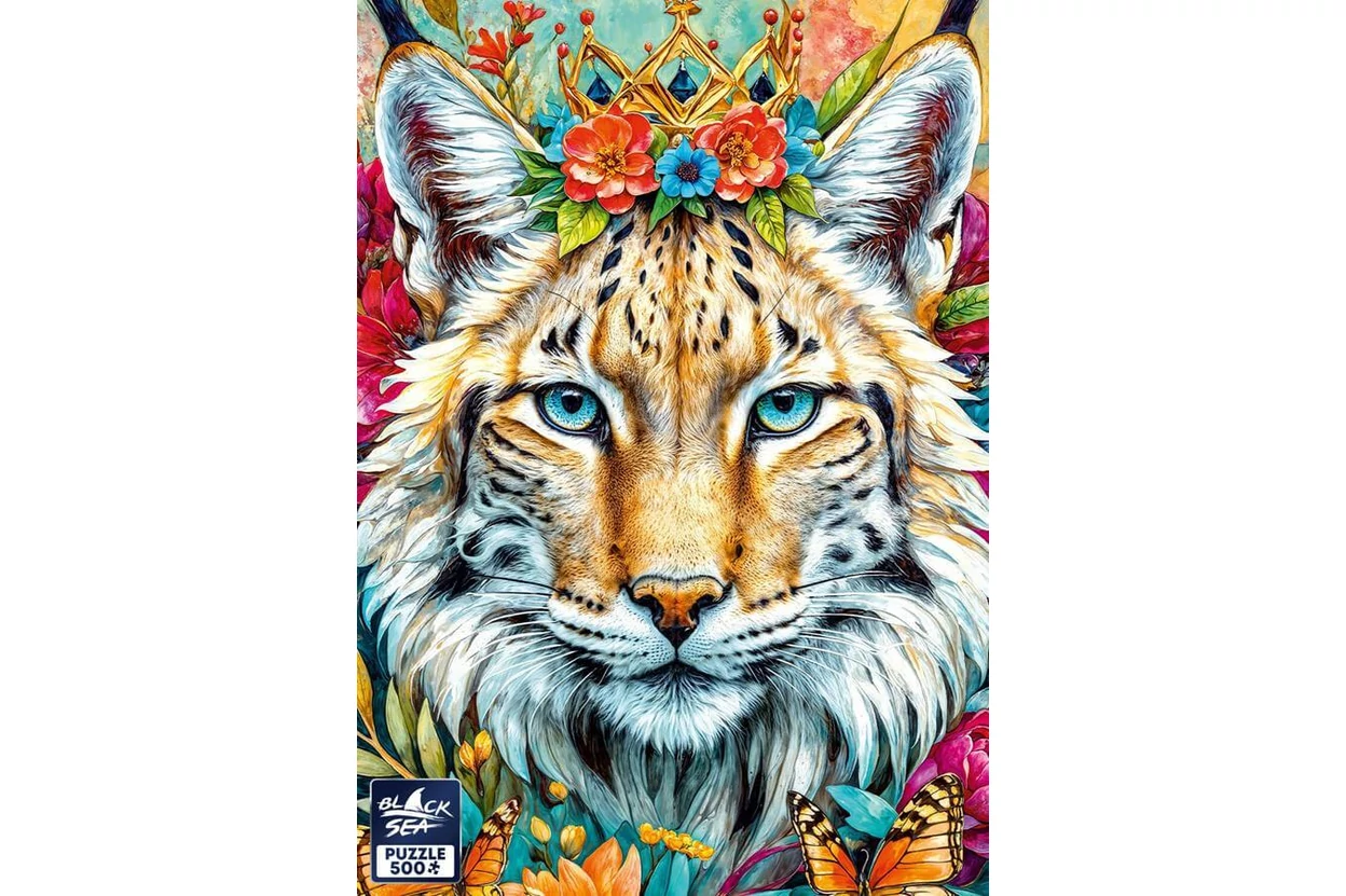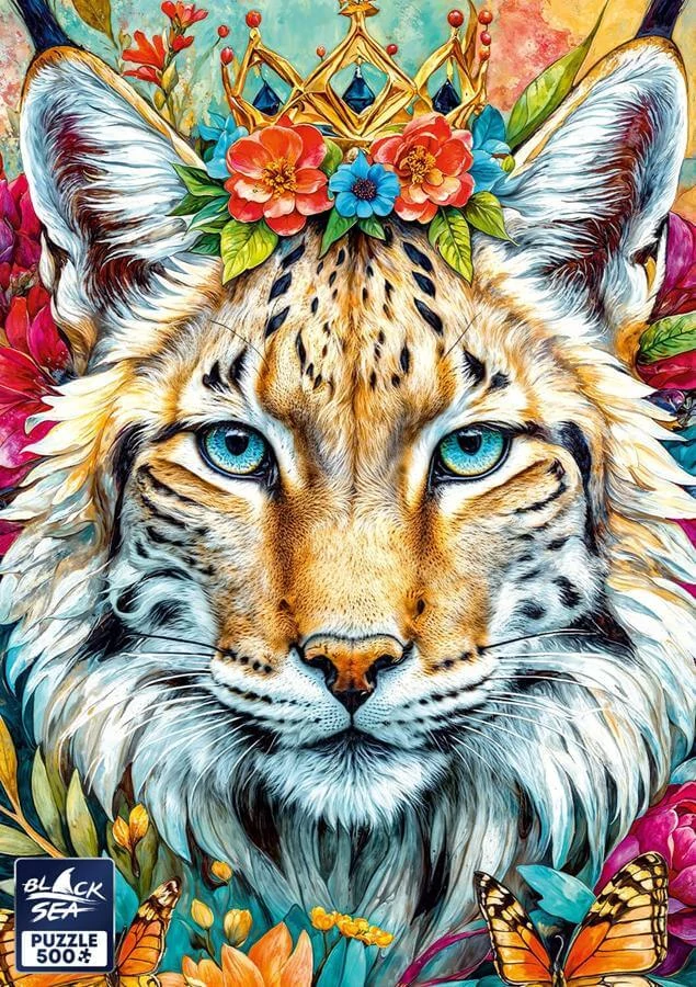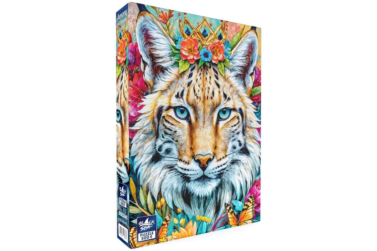 Vad szépség és csendes elegancia jellemzi a Black Sea BS82445 - Among the Flowers - Lynx - 500 db-os puzzle képét. Egy csodaszép hiúz elevenedik meg virágok és pillangók között.