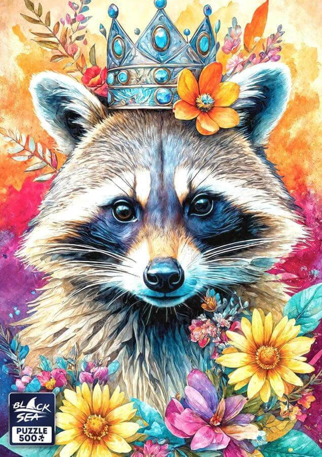Egy cuki mosómedve tekint ránk színes virágok közül, koronával a fején. A Black Sea BS82505 - Among the Flowers - Raccoon - 500 db-os puzzle vidám képe mesés hangulatot teremt.