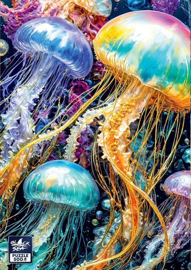 Szivárványszínű medúzák kusza szövevénye. Fedezd fel a Black Sea BS82521 - Precious creatures - Jellyfish - 500 db-os puzzle hipnotikus, víz alatti látványvilágát és relaxálj!
