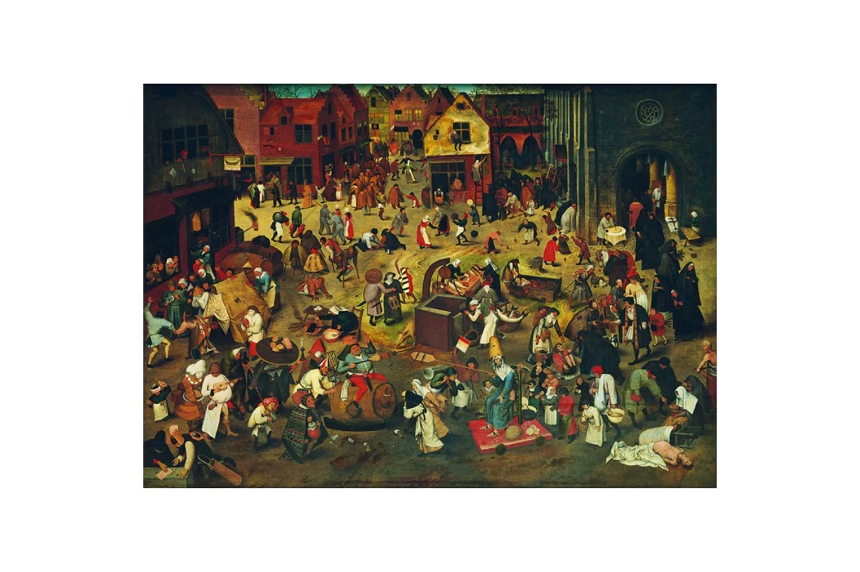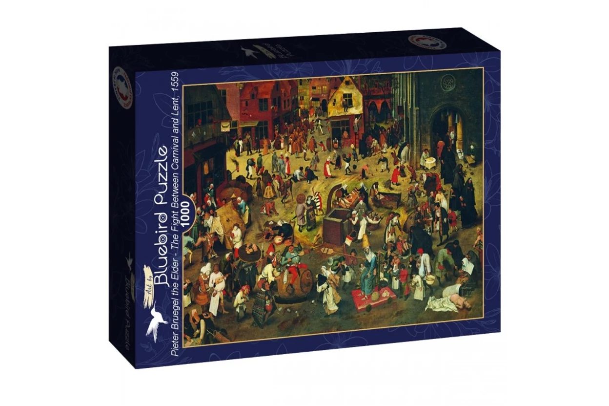 Az 1000 db-os Bluebird Art by puzzle képén a flamand művész a farsang és a nagyböjt közötti szimbolikus harcot mutatja be.