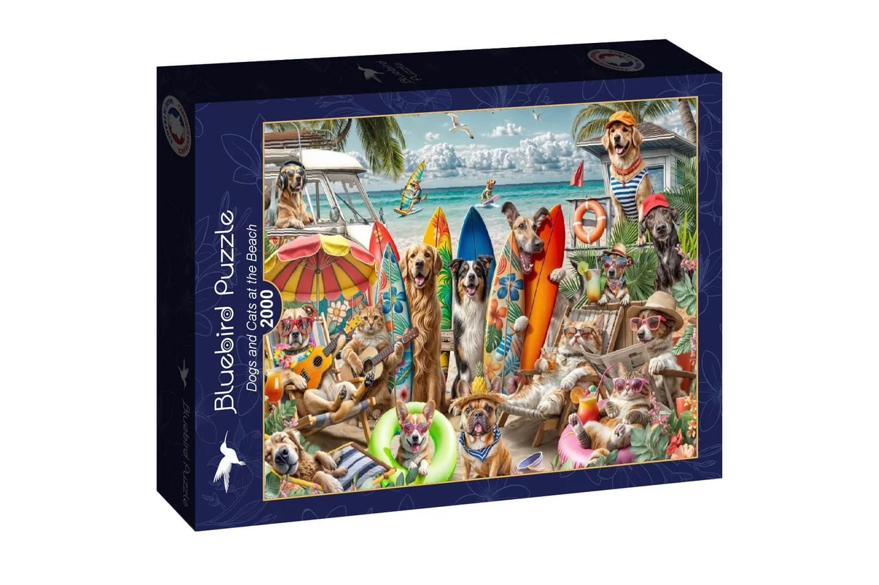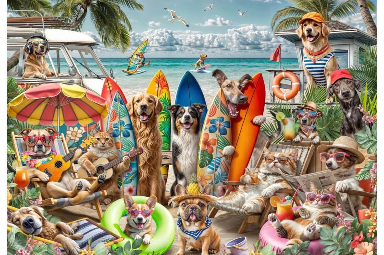Vidám kutyák és macskák élvezik a napfényt és a strand nyújtotta örömöket. A Bluebird 91023 - Dogs and Cats at the Beach - 2000 db-os puzzle képén egy igazi nyári, tengerparti állatparádé elevenedik meg.