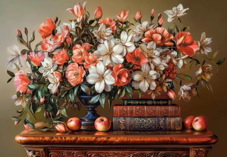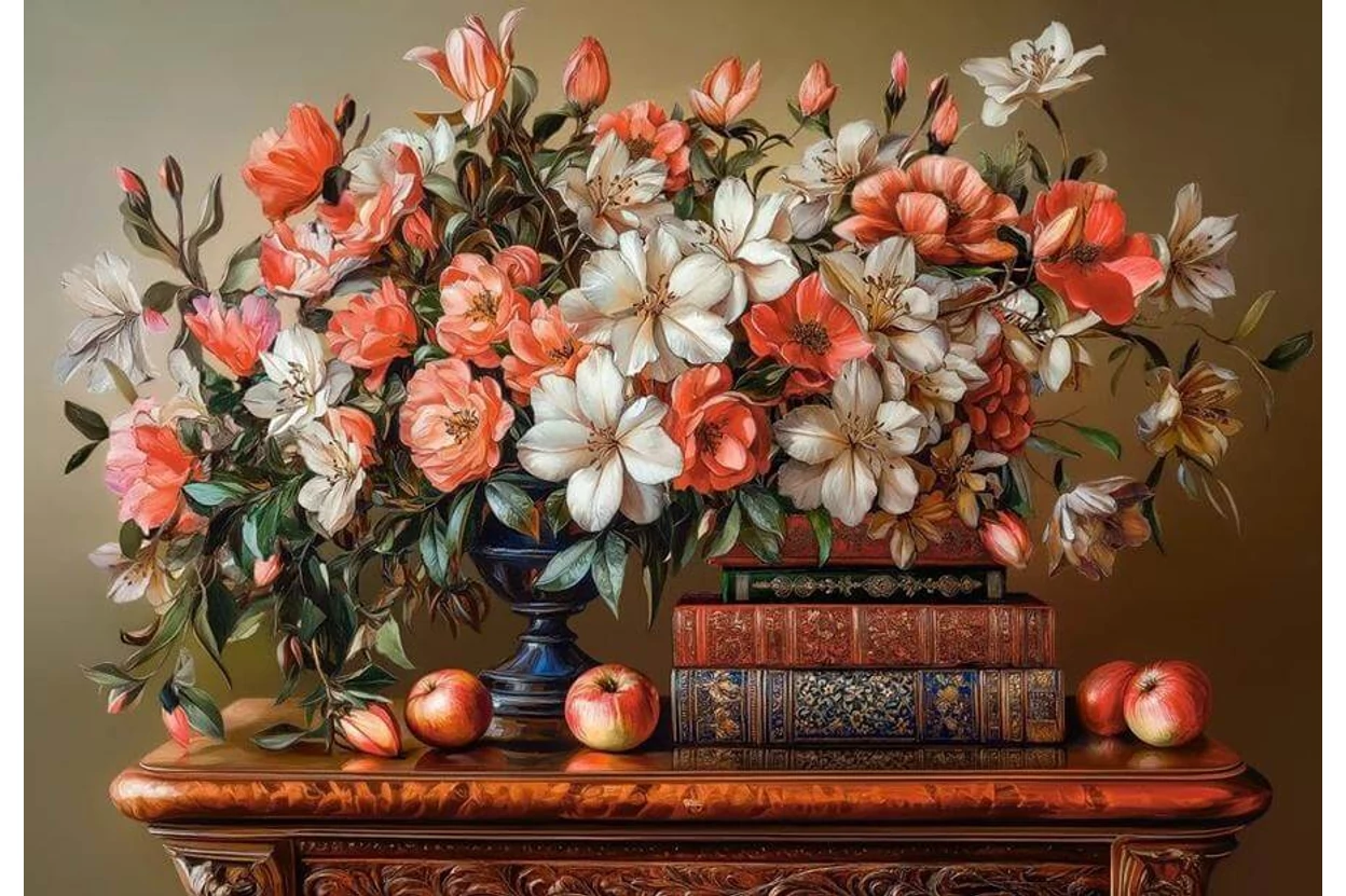 A Castorland C-105373 - Virágos este - 1000 db-os puzzle című képen egy békés csendélet elevenedik meg egy meseszép virágcsokorral, könyvekkel és almákkal.