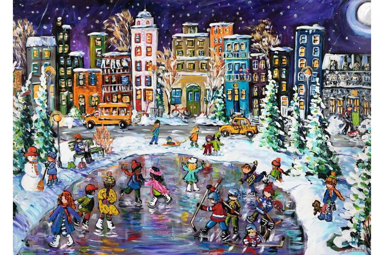 Ezen a Ravensburger 1000 db-os puzzle - Canadian Collection - Canadian City Lights (12000828) kirakón egy karácsonyi hangulatú képet láthatunk Kanadában, ahol a jégen hokiznak a gyerekek.