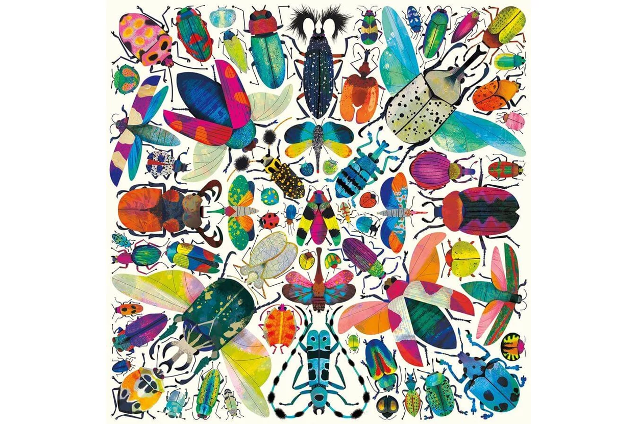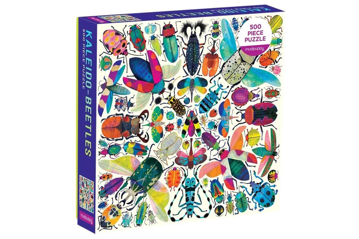 Kaleidoszkópszerű mintákban elrendezett színes bogarak díszítik a képet. A Galison 62338 - Mudpuppy - Kaleido Beetles - 500 db-os puzzle látványos és egyedi kirakó a természet és a rovarok kedvelőinek.