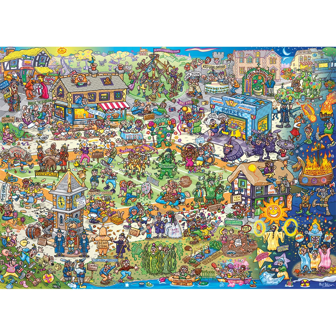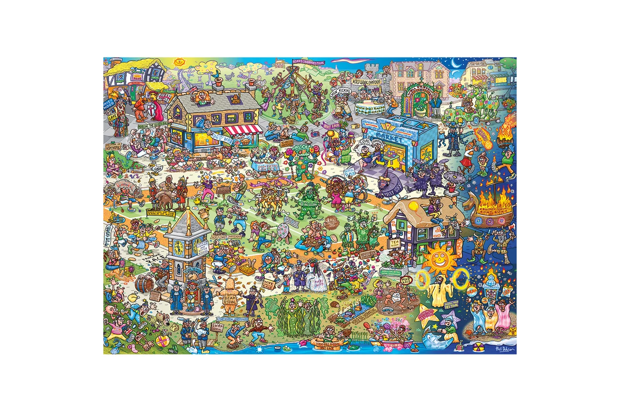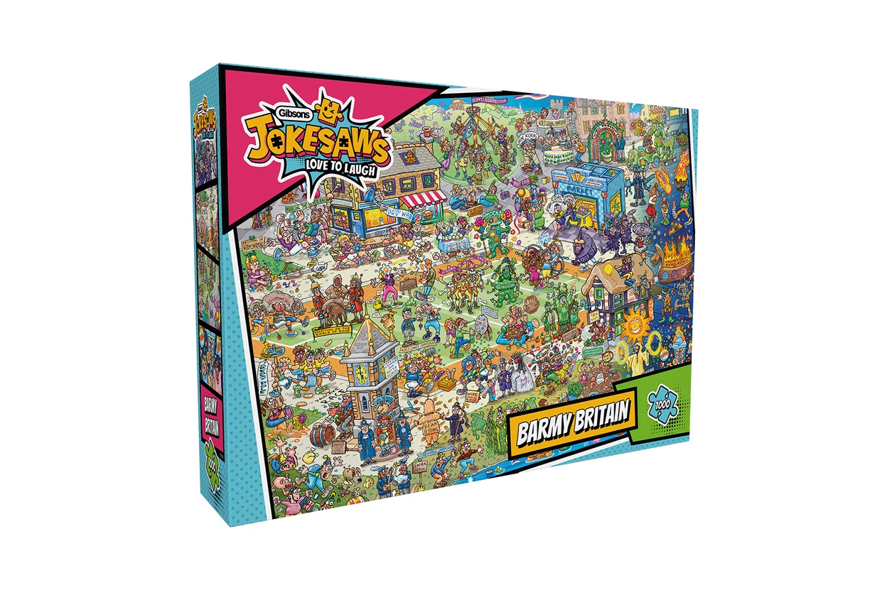 A Gibsons 1000 db-os puzzle – Jokesaws – Barmy Britain (7152) egy szórakoztató kirakó, amely a brit szigetország különleges és szórakoztató pillanatait ábrázolja. A részletgazdag illusztráción olyan szokatlan események jelennek meg, mint a mocsári búvárversenyek és a yorkshire-i pudingfutás, mindezt egy színes és vidám stílusban.