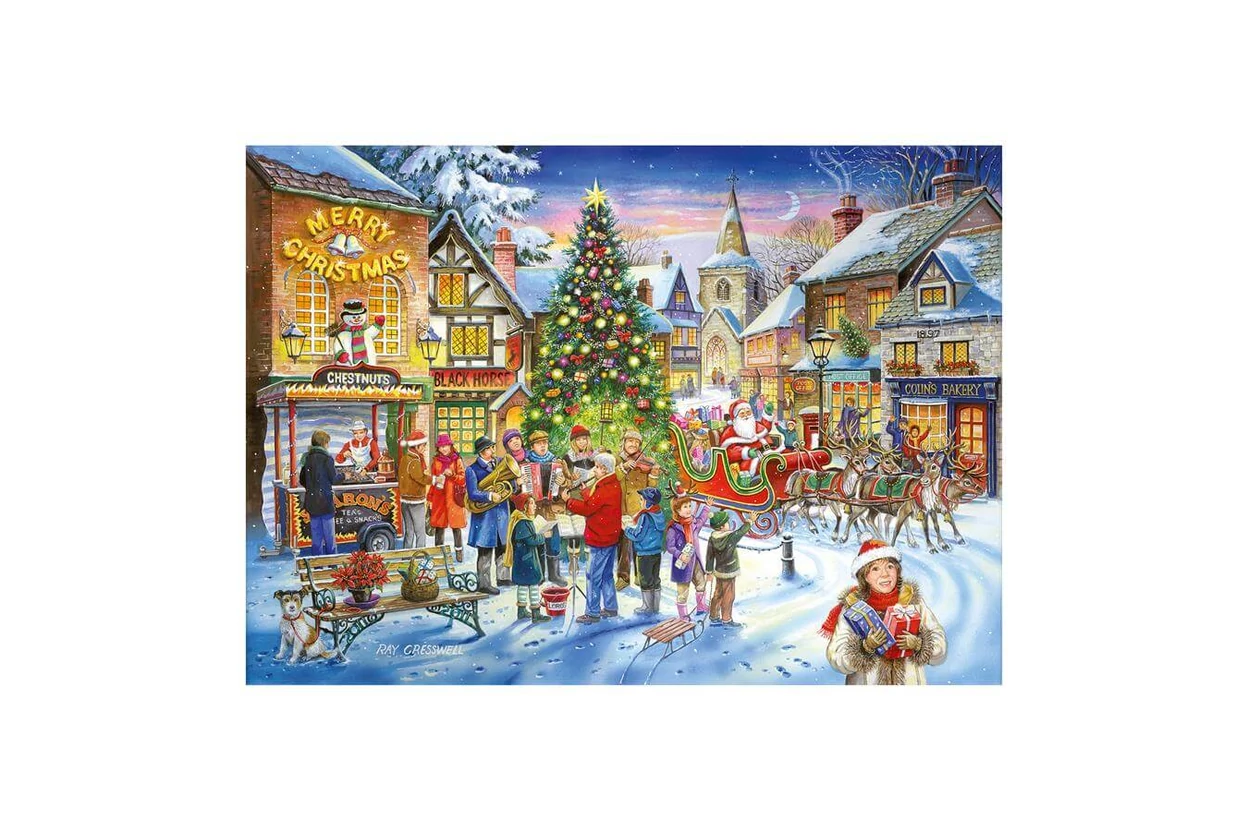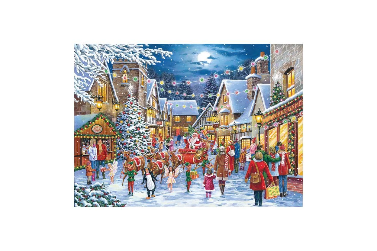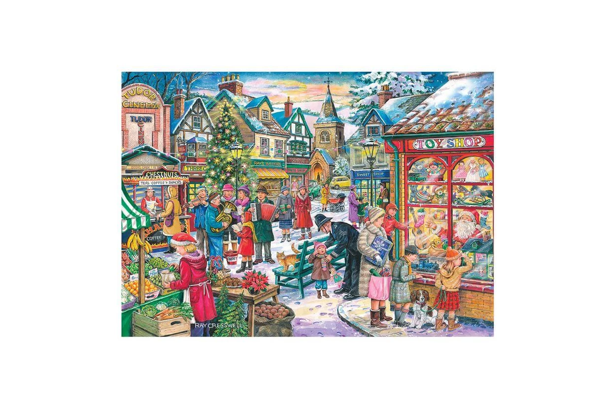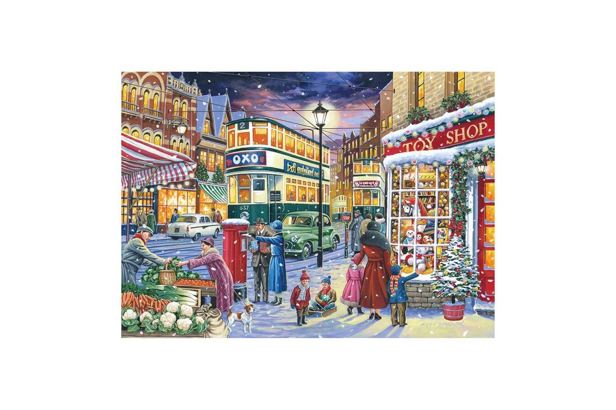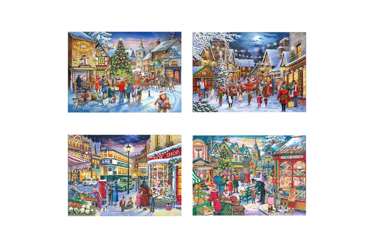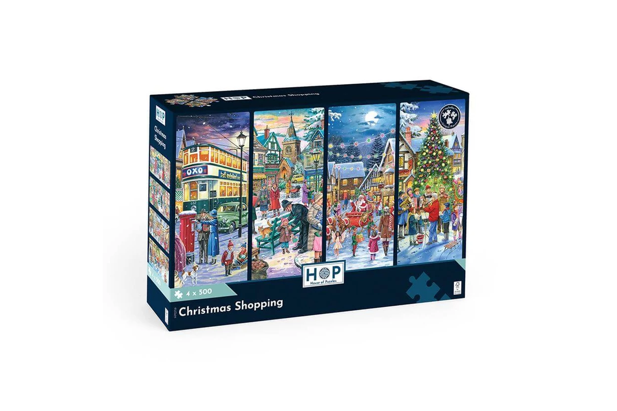 A House of Puzzles 0719 - Christmas Shopping - 4 x 500 db-os puzzle képén nyüzsgő karácsonyi vásárlás látható díszes kirakatokkal.