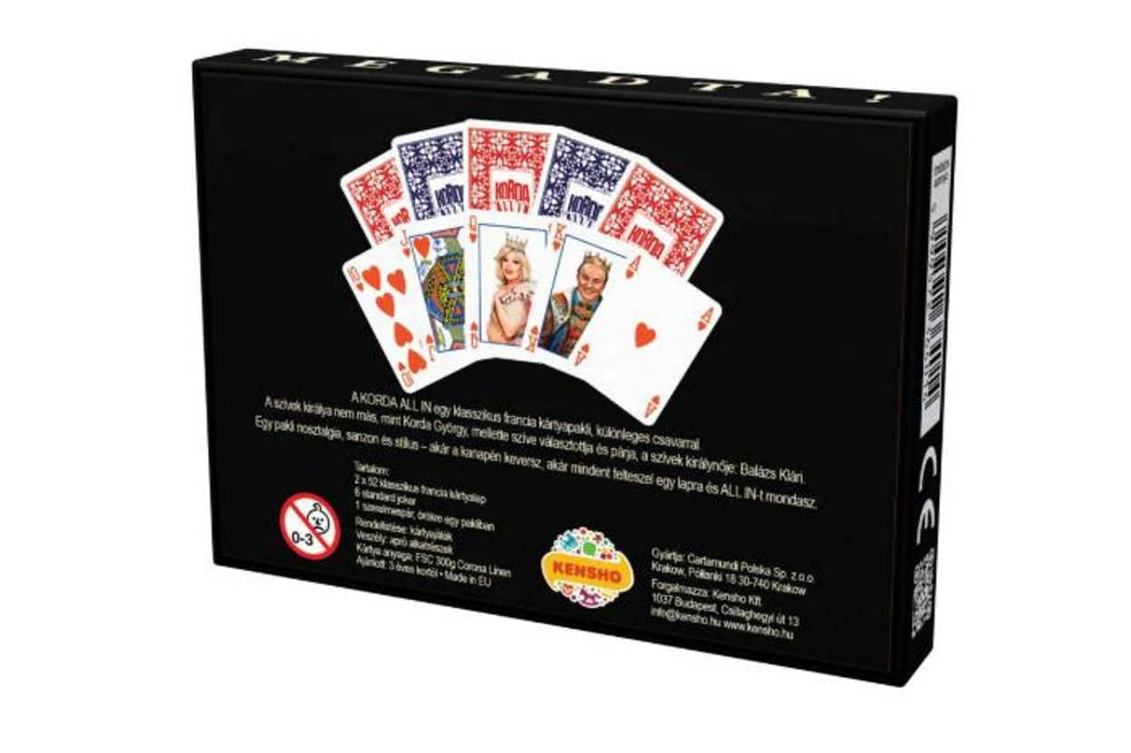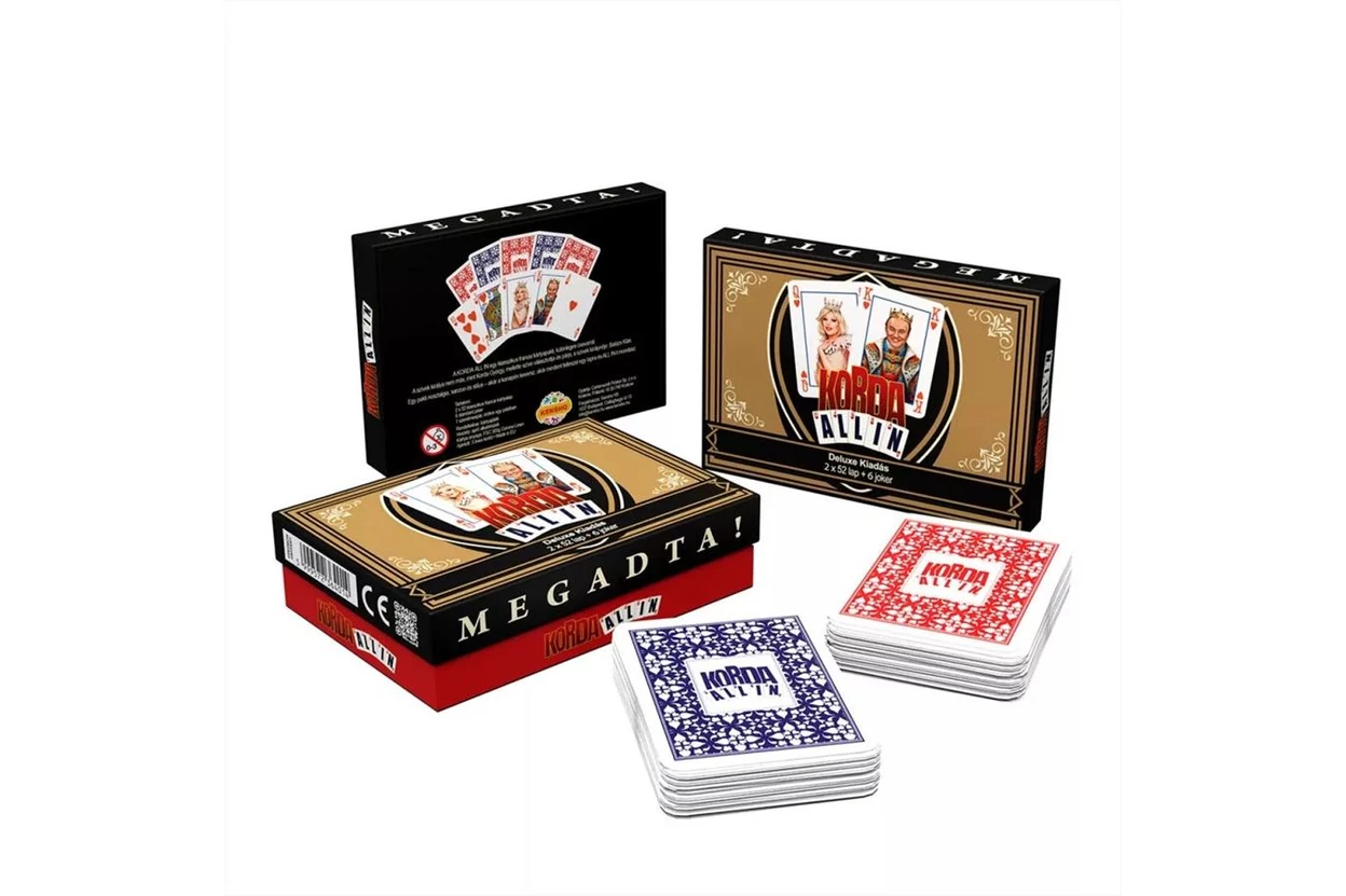 Lépj szintet a pókerasztalnál a Korda All-in Deluxe kiadással! Az 52 lapos, prémium minőségű paklit Korda György és Balázs Klári ikonikus stílusa teszi igazán különlegessé. Ez a Deluxe kiadás nem csak egy pakli, egy exkluzív pókerélmény minden alkalomra. Az egyedi Gyuri bácsis és Klárikás kártyák vidám hangulatot visznek a játékba, legyen szó baráti meccsről vagy komoly partikról