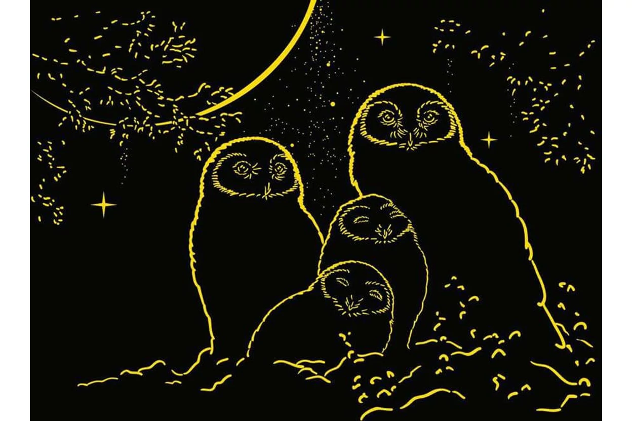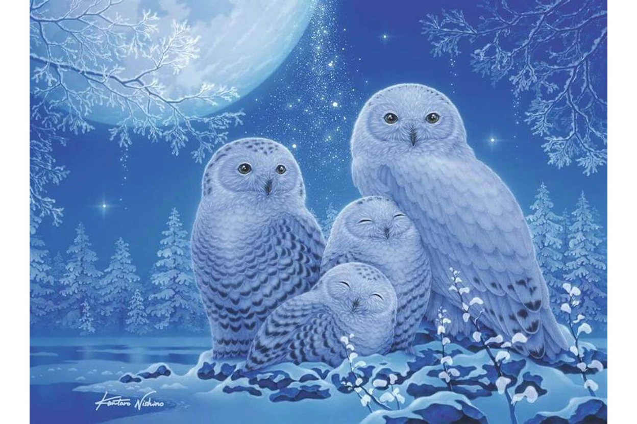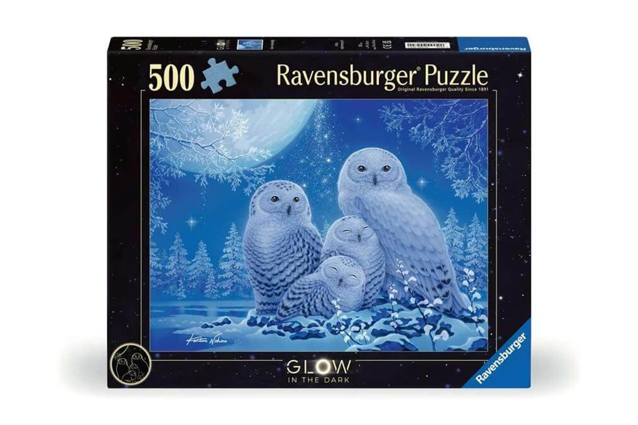 Bájos baglyok ülnek a holdfényben, összebújva. A Ravensburger 12000479 - Baglyok a holdfényben - 500 db-os Fluoreszkáló puzzle kontúrvonalai világítanak a sötétben.