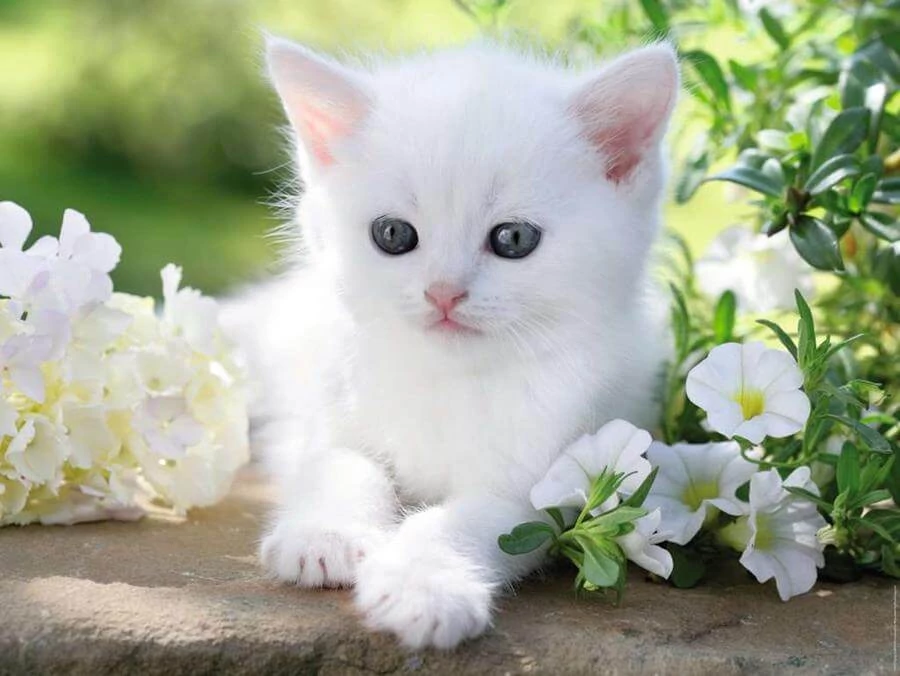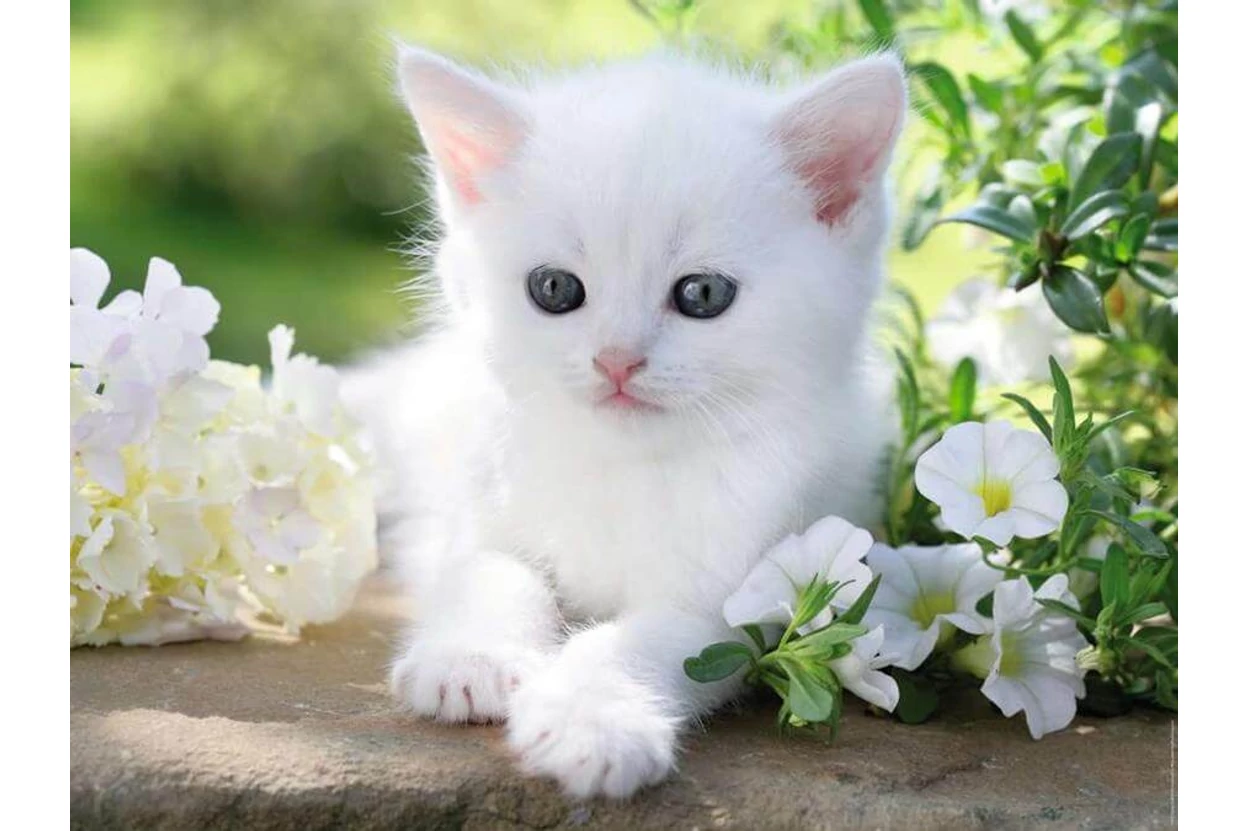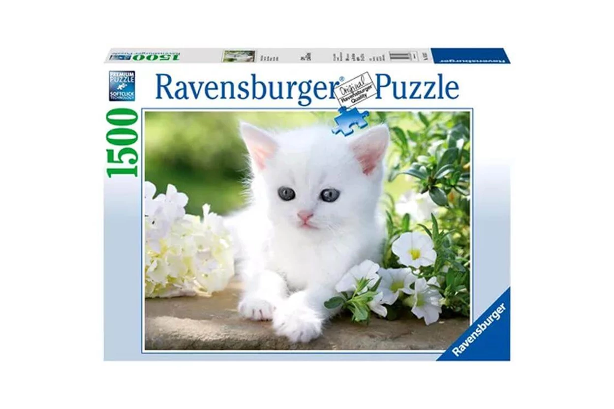 Aranyos, fehér kiscica pihen a virágok között. A Ravensburger 12000706 - Fehér cica - 1500 db-os puzzle finom részletei békés és meghitt hangulatot árasztanak.