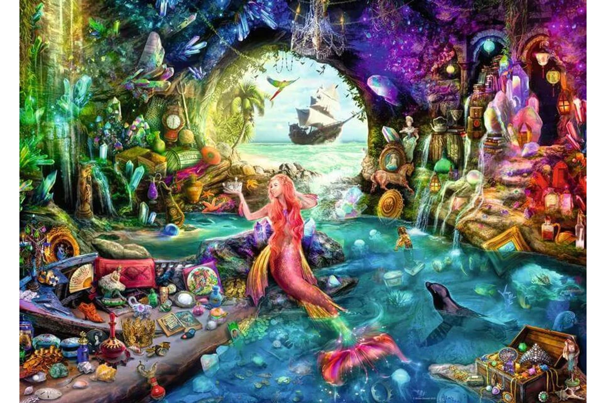 Egy mesés, rejtett barlangban találjuk magunkat a Ravensburger 12001577 - Sellők kincse - 1000 db-os puzzle képén, egy sellő és tündöklő kincsek társaságában. A kép minden részlete a fantázia birodalmába repít.