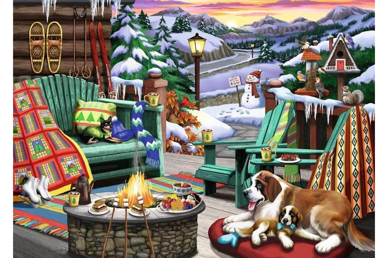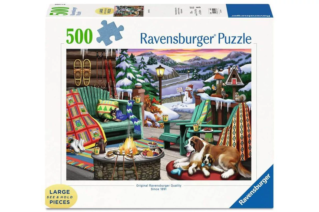 A Ravensburger 16442 - Síelés és lazulás - 500 db-os XXL puzzle vidám téli jelenetében a síelés és a kikapcsolódás egyszerre elevenedik meg. Havas fenyvesek, madárkák, mókusok, a tűz körül pedig színes takarók és kedves kutyák: igazi bekuckózós élmény a hosszú téli estékre.