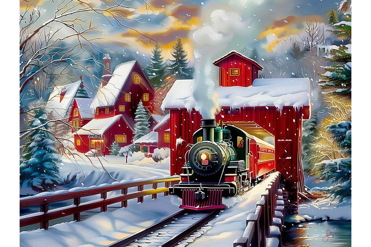 Egy békebeli gőzmozdony a festői téli tájban. A SunsOut 77130 - Winter Creek Bridge - 1000 db-os puzzle idilli és nyugodt kirakóélményt kínál.