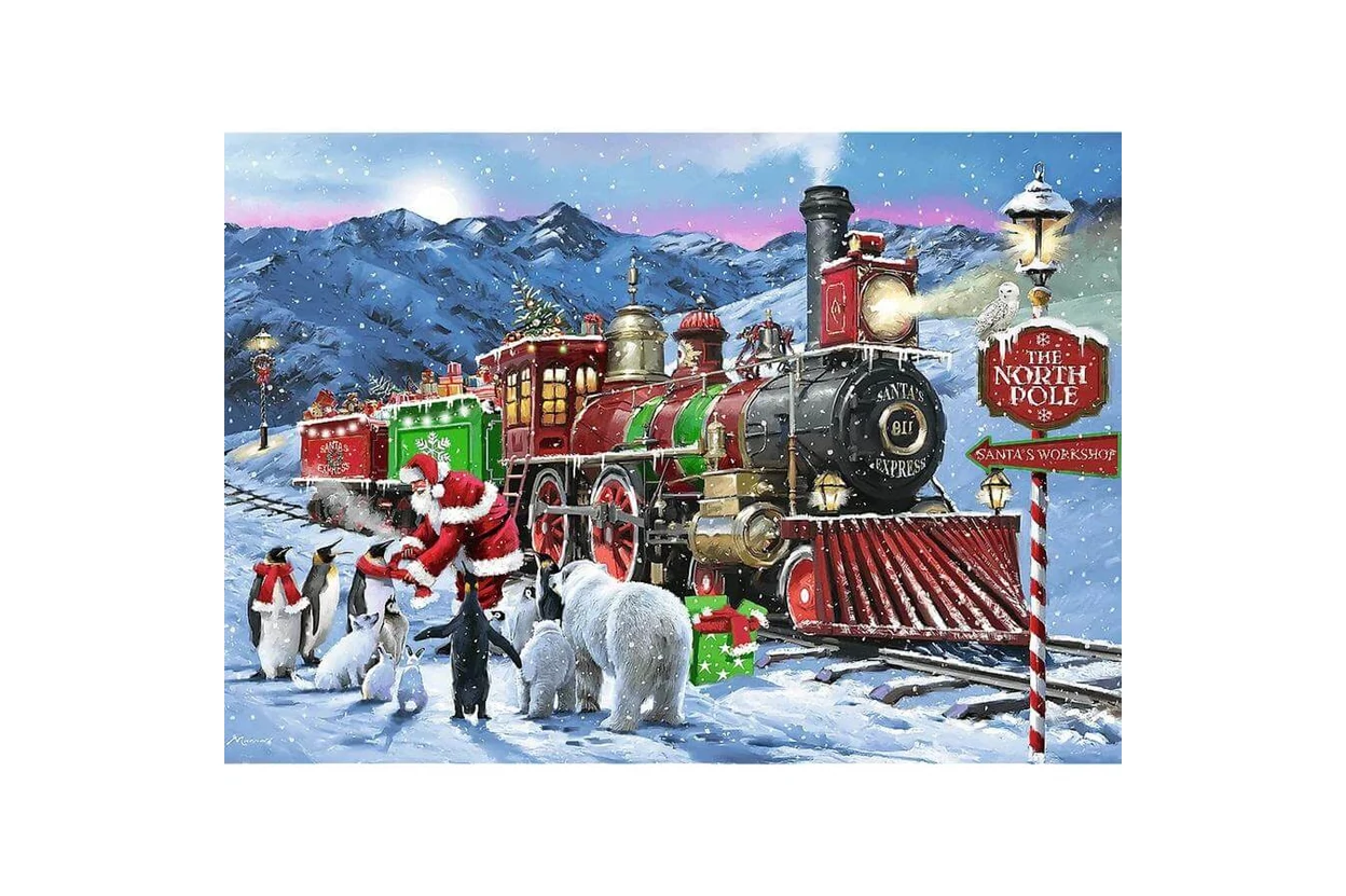 Hangulatos, ünnepi jelenet egy díszes karácsonyi vonattal, a Mikulással és az Északi-sark lakóival. A Trefl 12097 - Tea Time - Karácsonyi vonat - 1000 db-os Premium Plus puzzle meleg színei igazi téli hangulatot teremtenek.