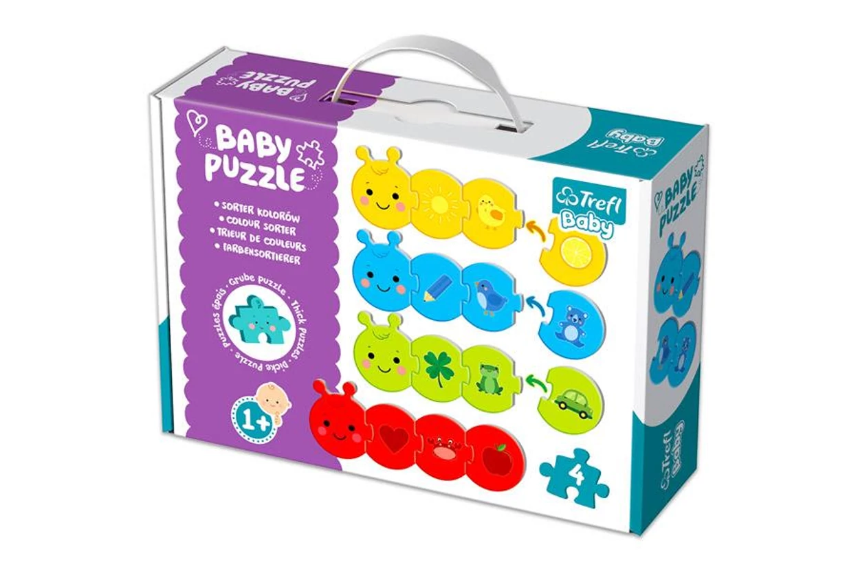 Oktató puzzle a legkisebbek számára. A vastag, nagyméretű karton puzzle elemek megkönnyítik a kis kezek számára az összeillesztést. A doboz 4 kirakót tartalmaz, melyek mindegyike 4 darabos, így ez a kirakó tökéletes választás a legkisebbeknek. Játék közben a gyerekek könnyedén megtanulhatják a színeket. A puzzle kirakása számos képességet fejleszt, türelemre tanít, finomítja a kézmozdulatokat, fejleszti a precizitást, a koncentrációt és a megfigyelőképességet.