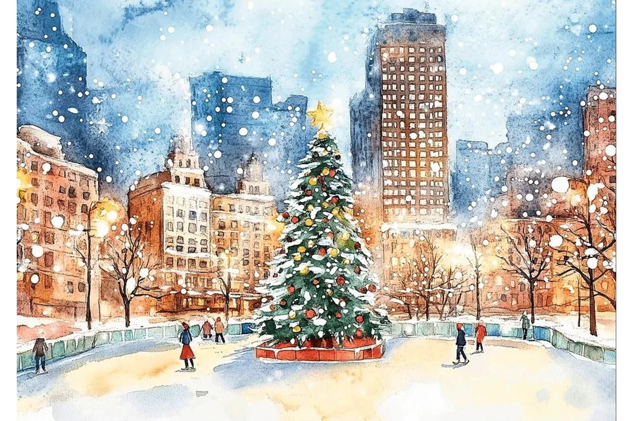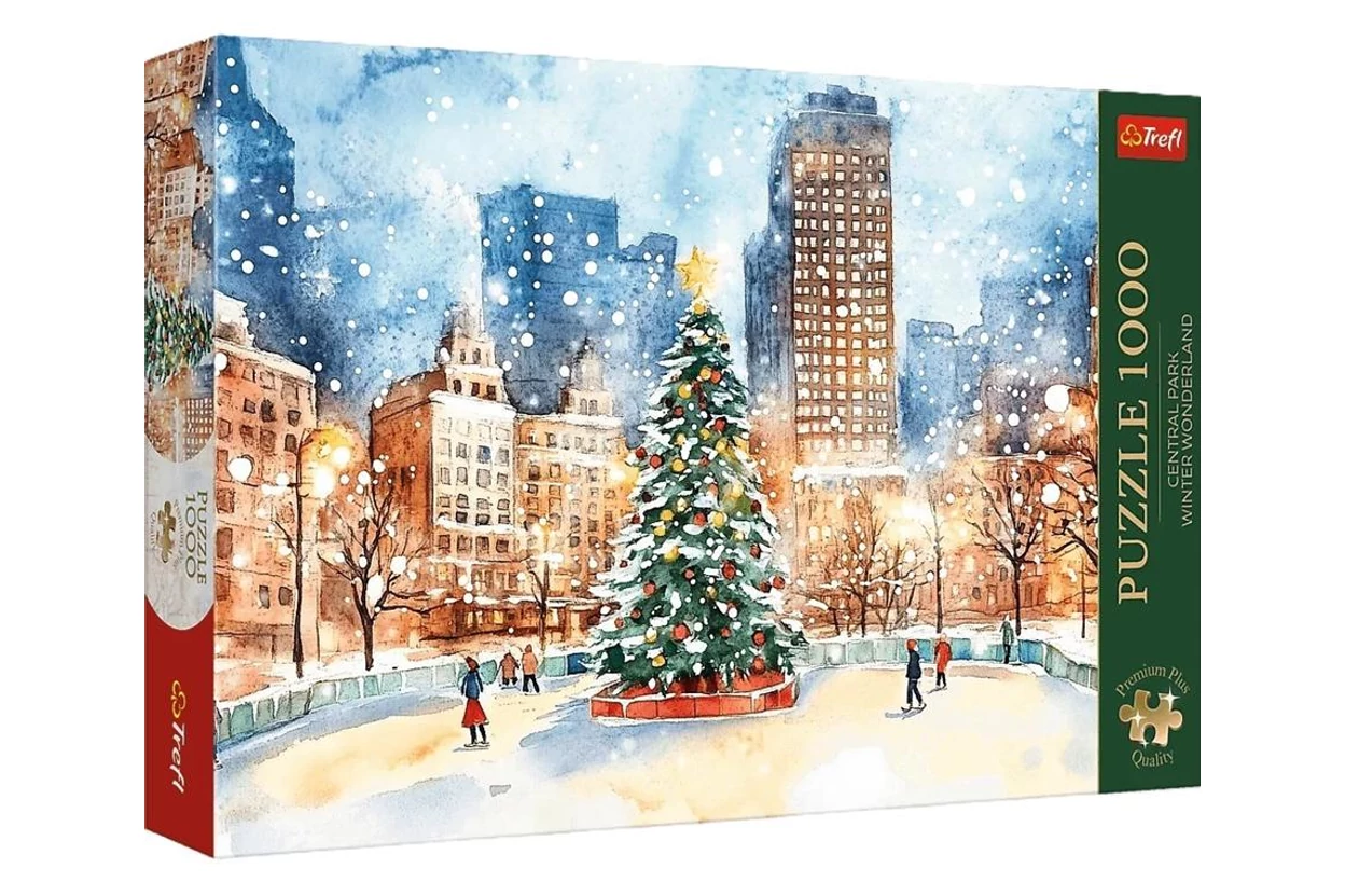Az ikonikus new york-i Central Park elevenedik meg a Trefl 99277 - Téli meseország a Central Parkban - 1000 db-os Premium Plus puzzle képén. Hóesés, korcsolyázók, meghitt fények és egy hatalmas karácsonyfa gondoskodnak az ünnepi hangulatról.