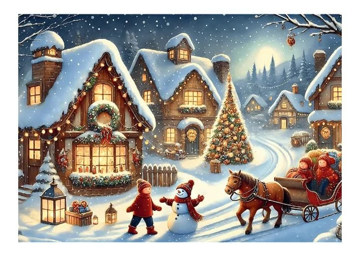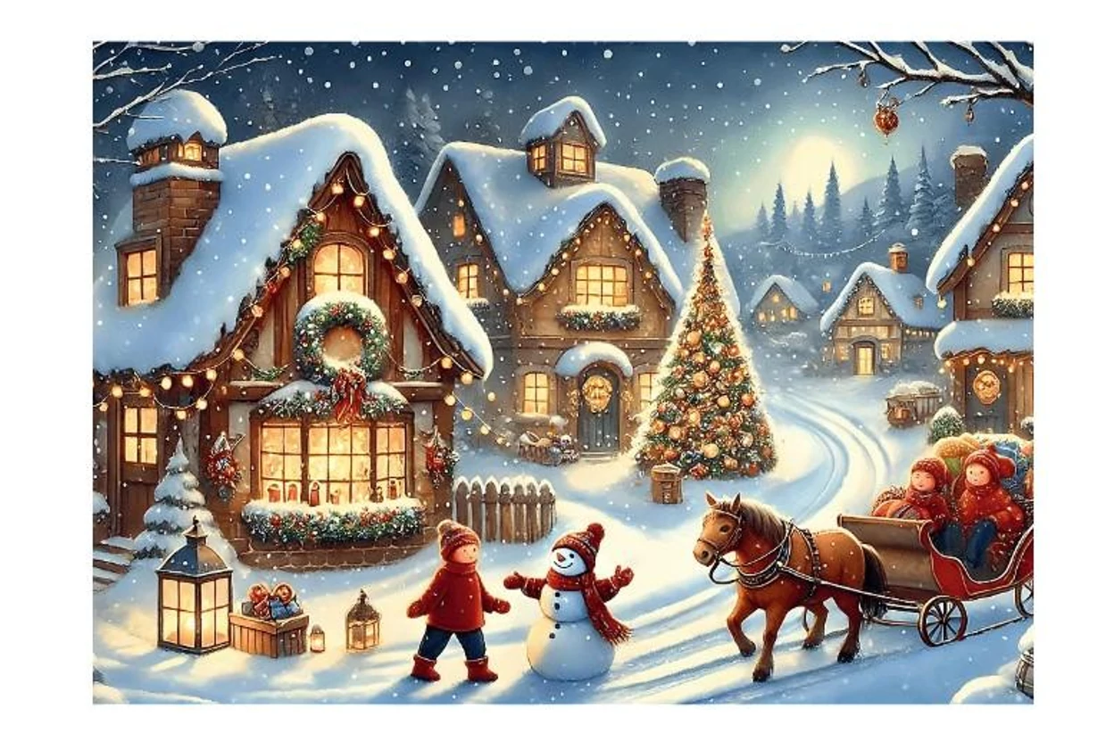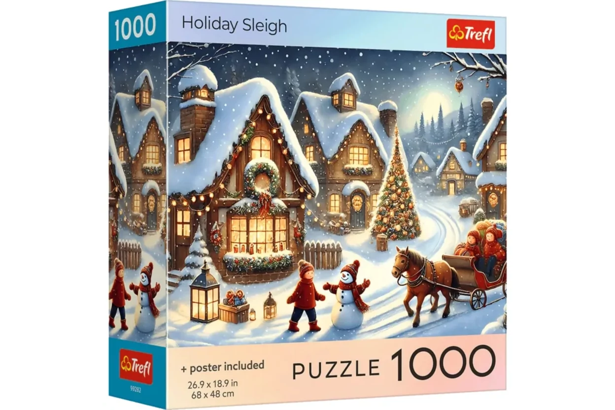 Éld át a téli ünnepek hangulatát egy színes puzzle formájában. Hangulatos, hófödte házikók, karácsonyi fények, egy hóember, egy karácsonyfa és egy lovasszán kelnek életre a Trefl 99282 - Ünnepi szán - 1000 db-os puzzle képén. A részletek melegséget és örömöt sugároznak.