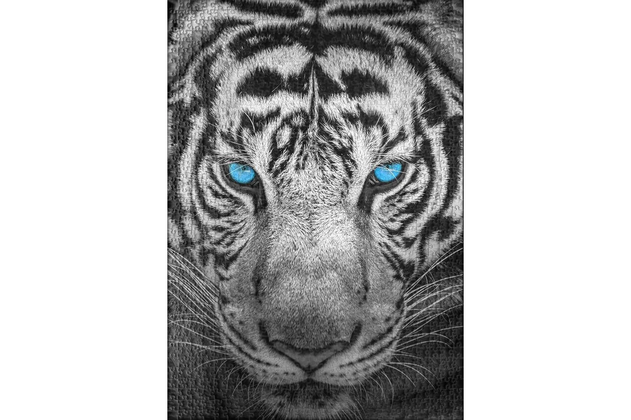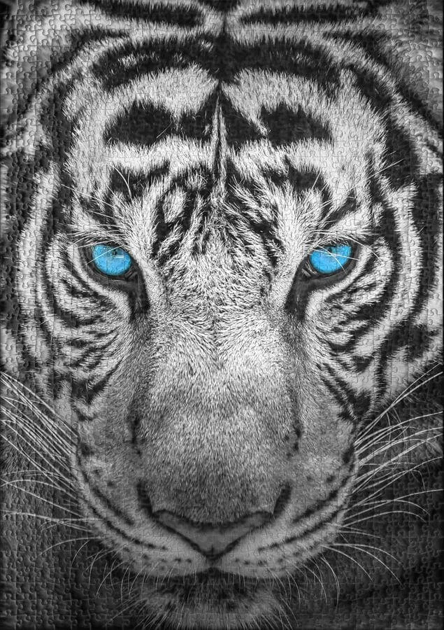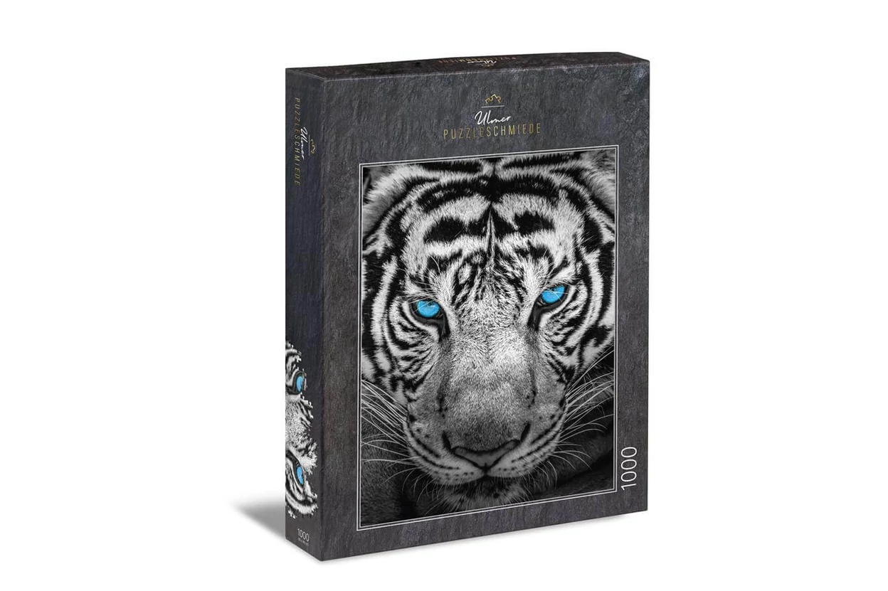 Egy lenyűgöző tigris portrét ábrázol az Ulmer 0008 - The Hunter - 1000 db-os puzzle. A kép monokróm színvilágaizgalmasvizuális élményt nyújt az élénk kék szemekkel.