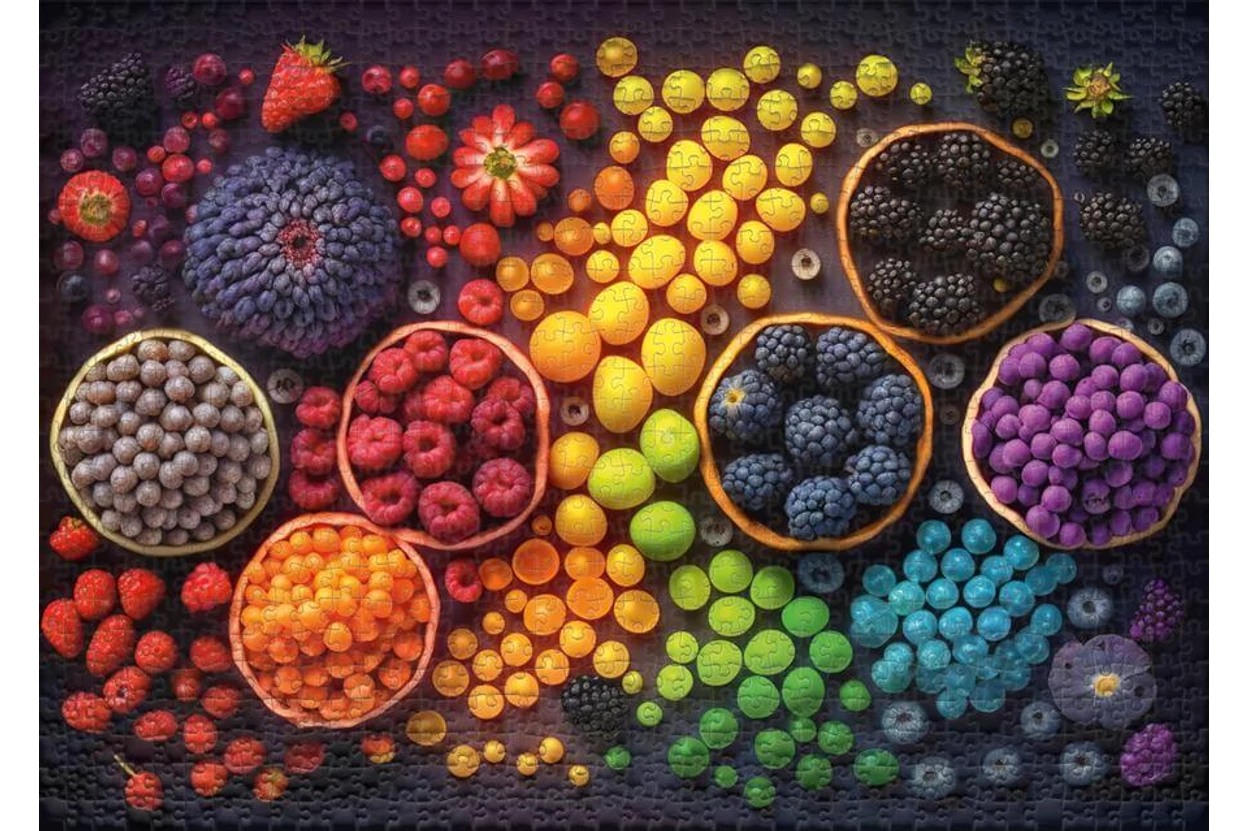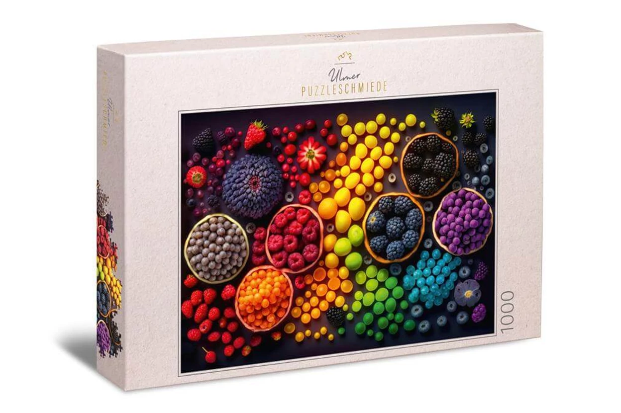 Csodás gyümölcsök pompáznak az Ulmer 3511 - Rainbow Fruits - 1000 db-os puzzle képén a szivárvány minden színében. A kirakó játékos és ínycsiklandó hangulatot kelt.