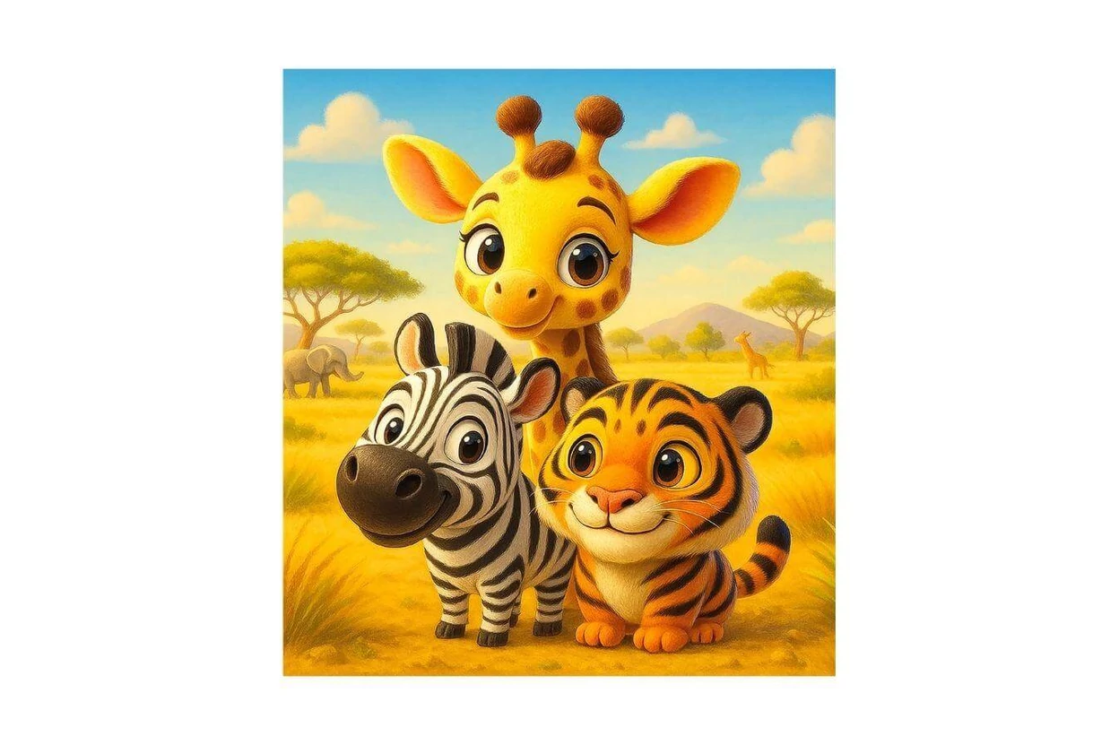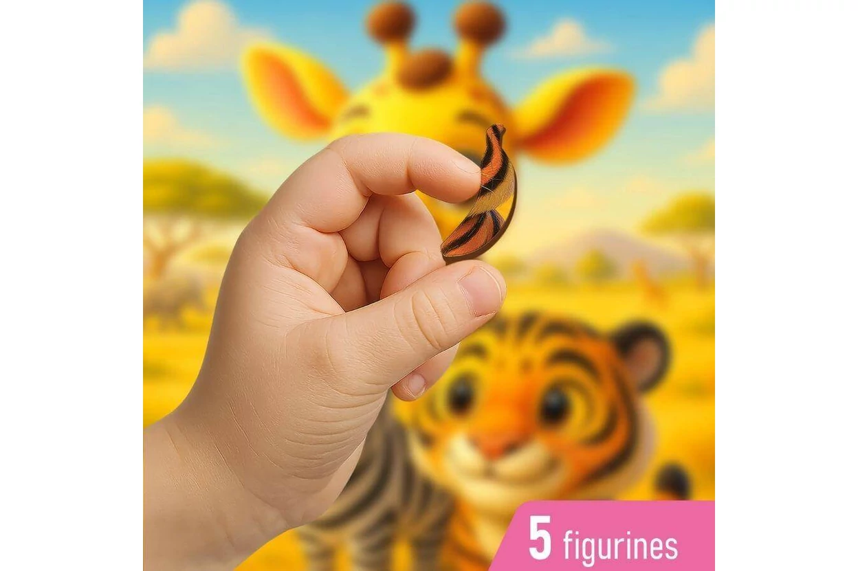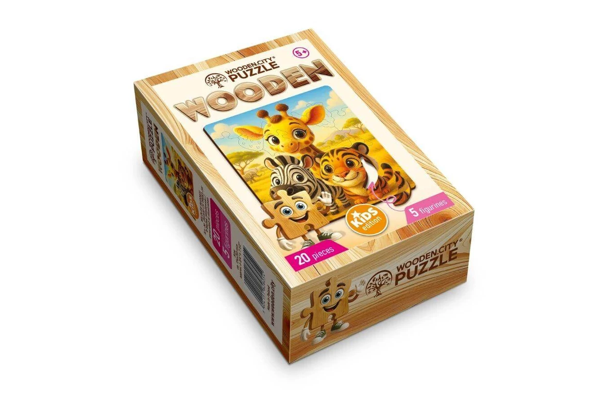 A 20 db-os kirakók 5 db egyedi formájú darabkát tartalmaznak az extra puzzle élményért. Afrikai állatkölykök gyűltek össze a Wooden City CH99053-SV - Afrikai barátok - 20 db-os fa puzzle színes képén: egy zsiráf, egy zebra és egy tigris. Gyorsan kirakható, kedves puzzle kisebb gyerekeknek.