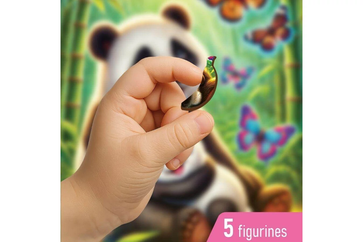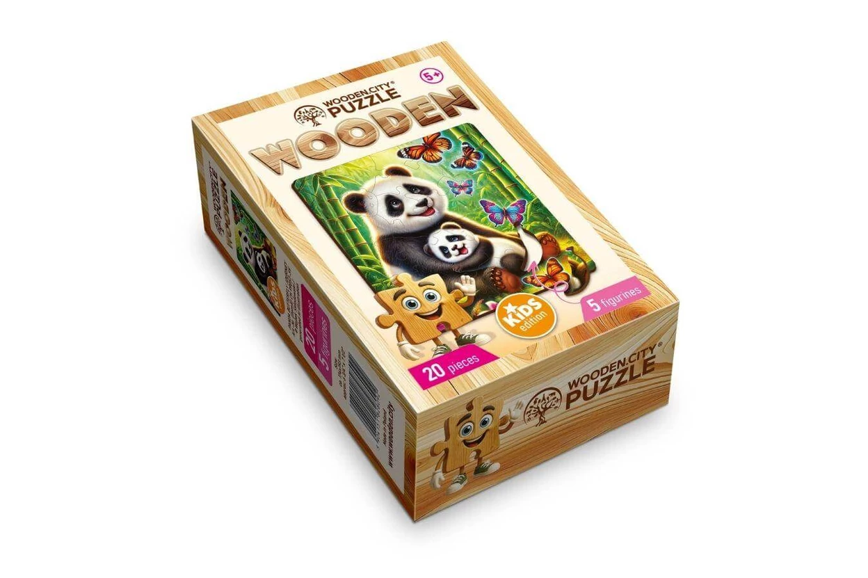 Pillangók és játékos pandák jelennek meg a kirakás után a Wooden City CH99057-SV - Pandák és pillangók - 20 db-os fa puzzle képén. A 20 db-os kirakó a legkisebbeknek készült és 5 db egyedi formájú darabkát tartalmaz az extra puzzle élményért.
